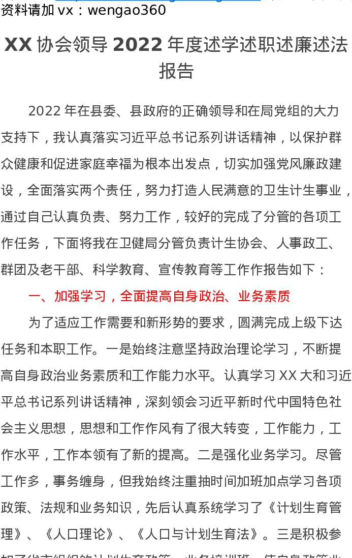 XX协会领导2022年度述学述职述廉述法报告