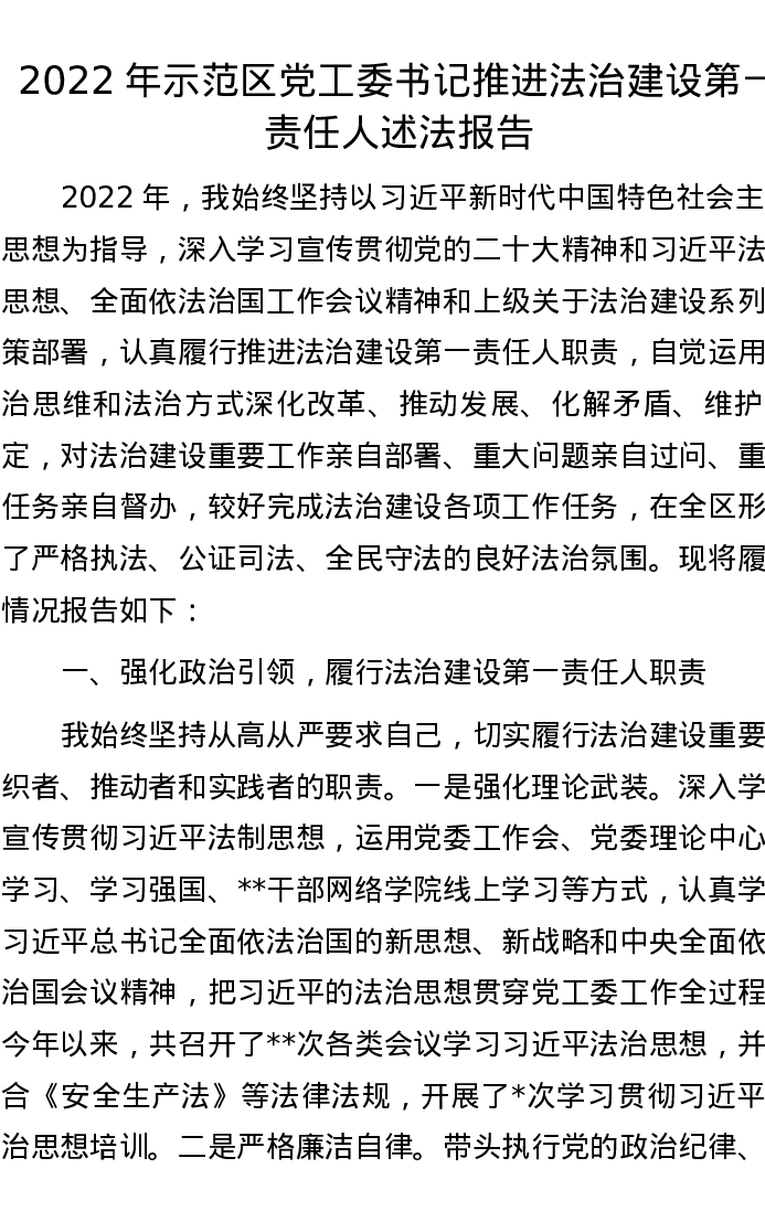 2022年示范区党工委书记推进法治建设第一责任人述法报告