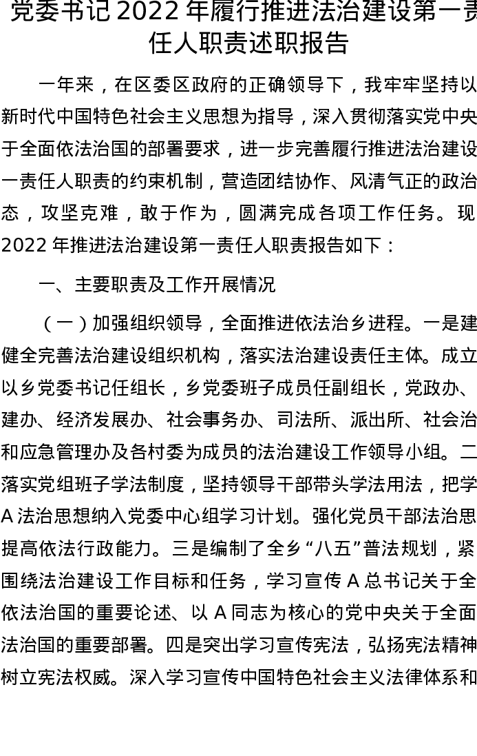 党委书记2022年履行推进法治建设第一责任人职责述职报告