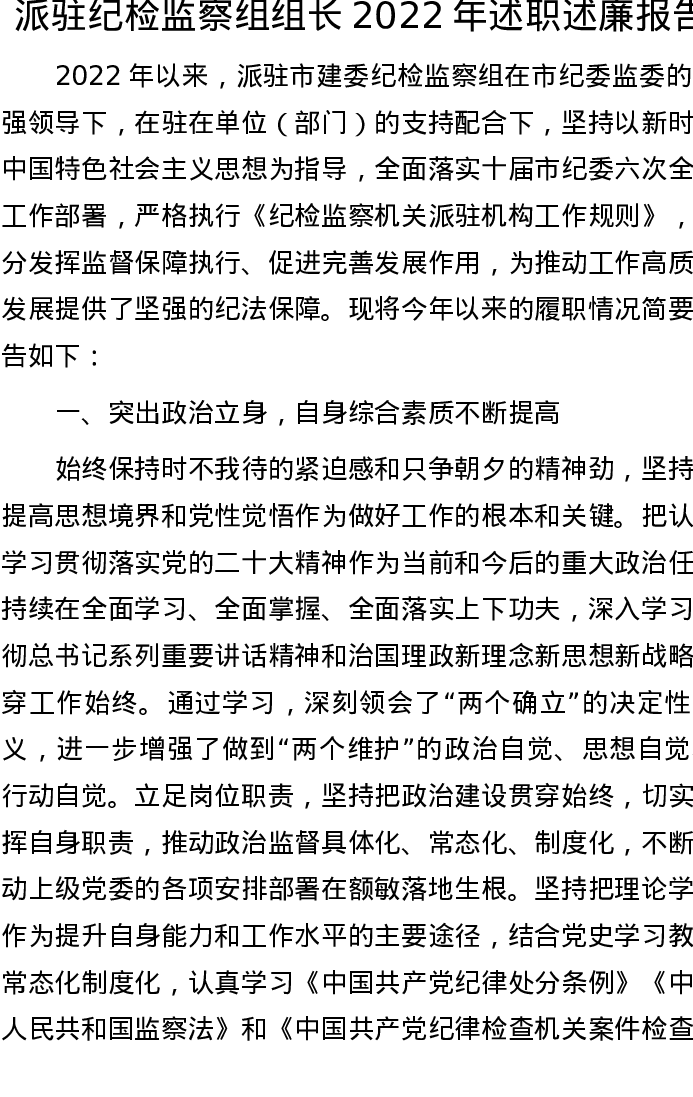 派驻纪检监察组组长2022年述职述廉报告
