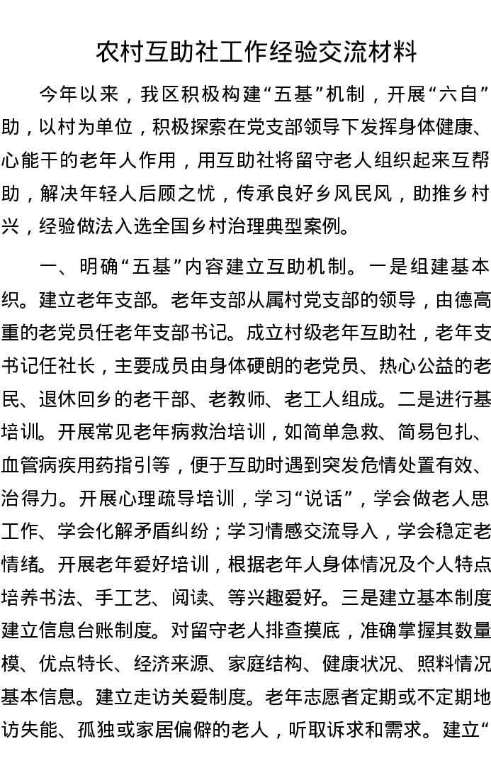 农村互助社工作经验交流材料