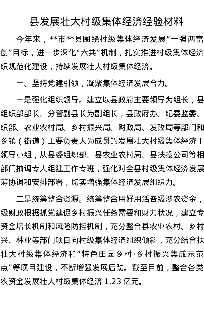 县发展壮大村级集体经济经验材料