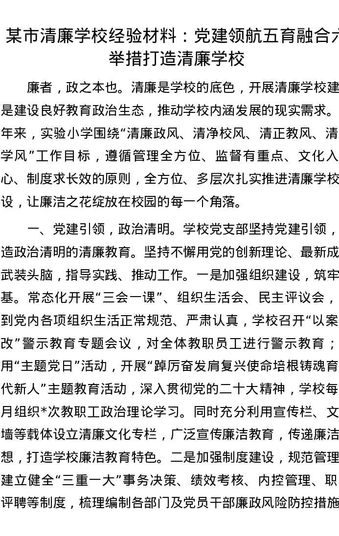 某市清廉学校经验材料:党建领航五育融合六举措打造清廉学校