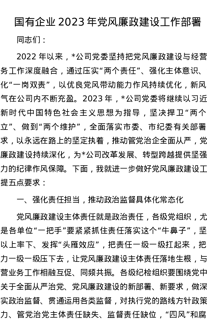 国有企业2023年党风廉政建设工作部署