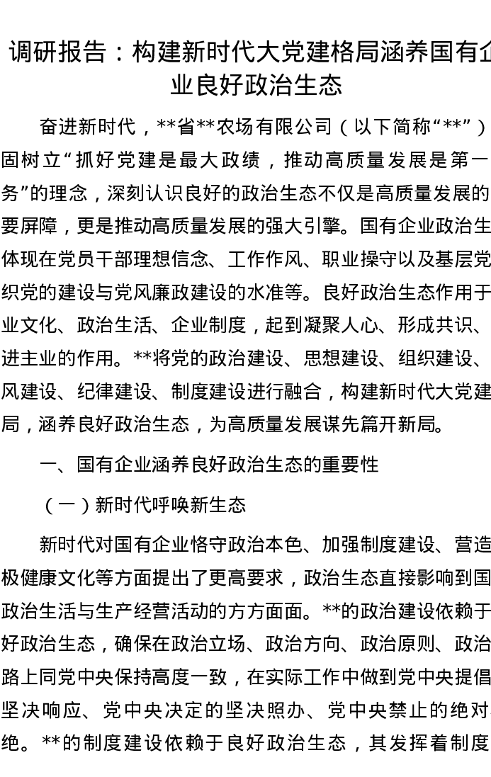 调研报告:构建新时代大党建格局涵养国有企业良好政治生态