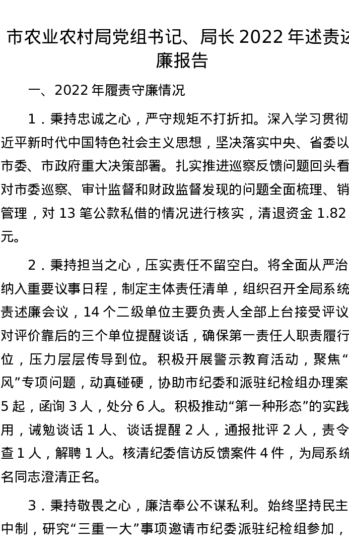 市农业农村局党组书记、局长2022年述责述廉报告