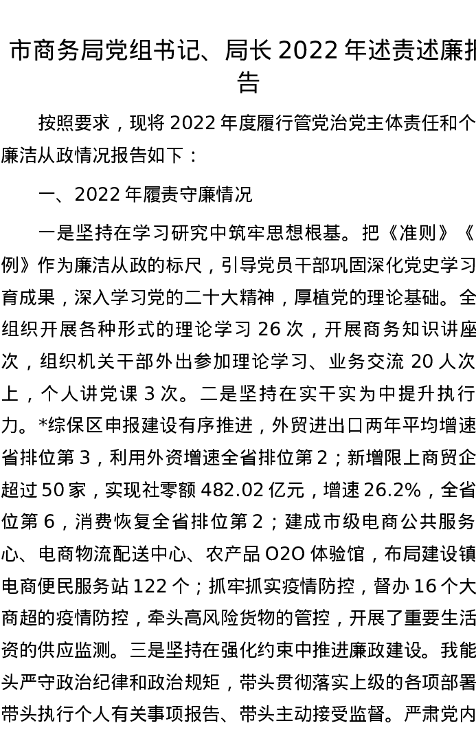 市商务局党组书记、局长2022年述责述廉报告