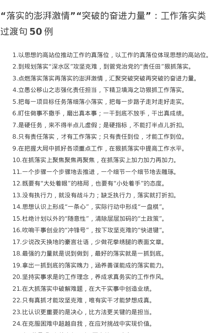 “落实的澎湃激情”“突破的奋进力量”:工作落实类过渡句50例
