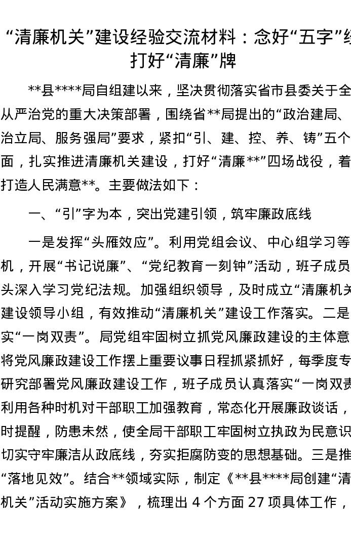 “清廉机关”建设经验交流材料:念好“五字”经 打好“清廉”牌