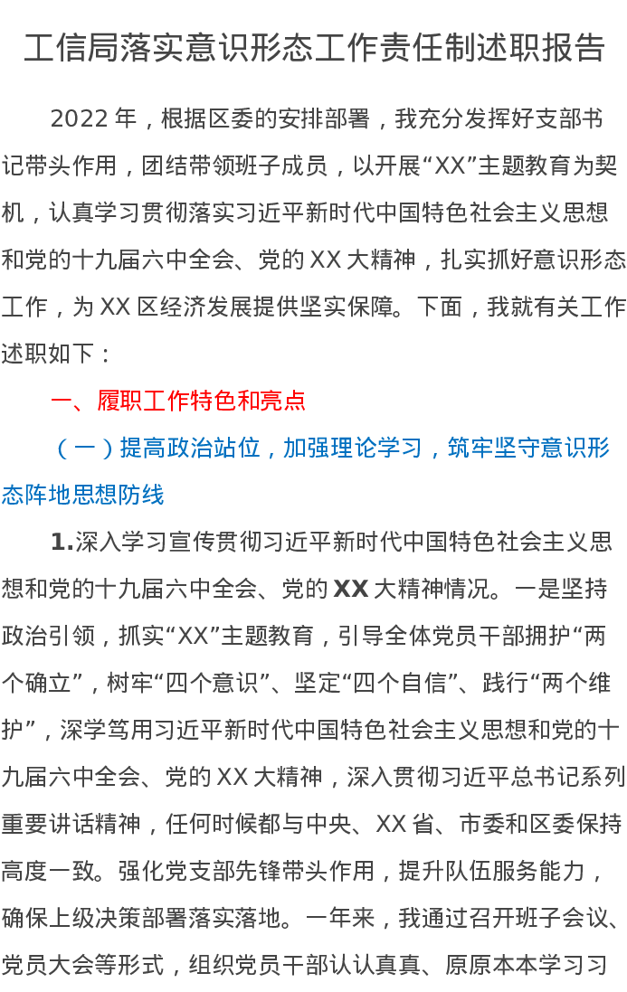 工信局落实意识形态工作责任制述职报告