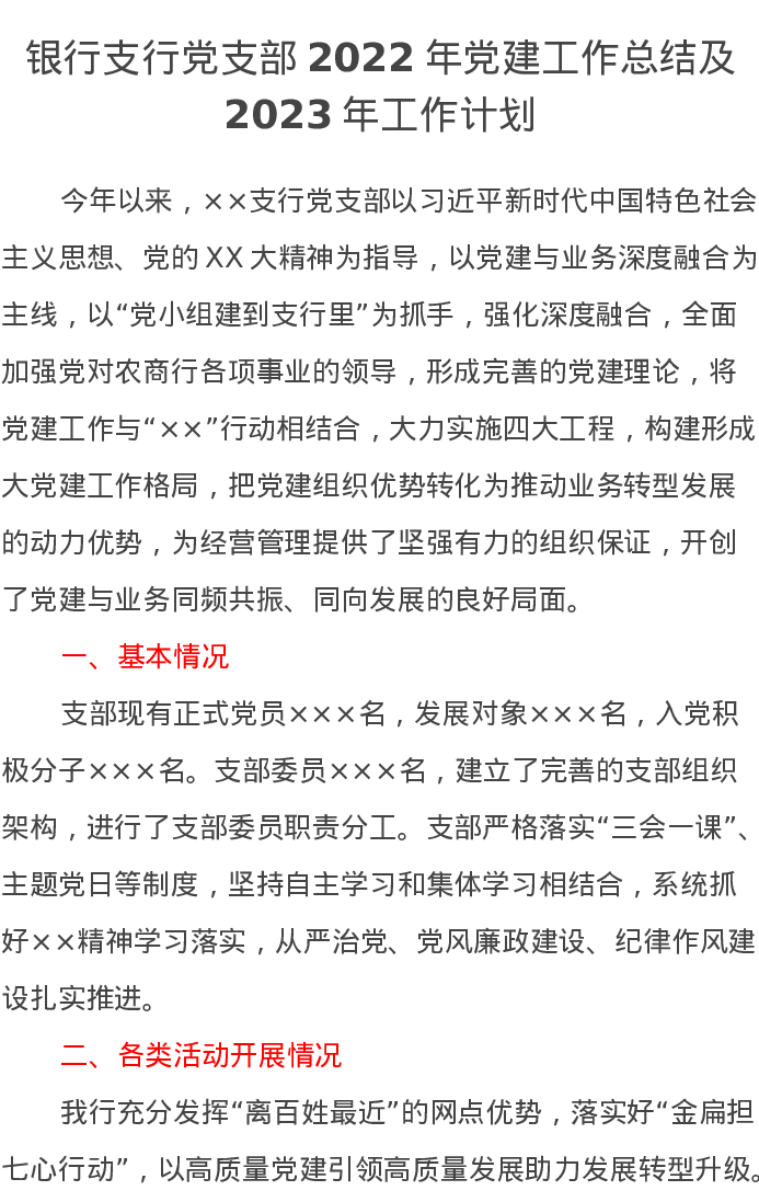 银行支行党支部2022年党建工作总结及2023年工作计划