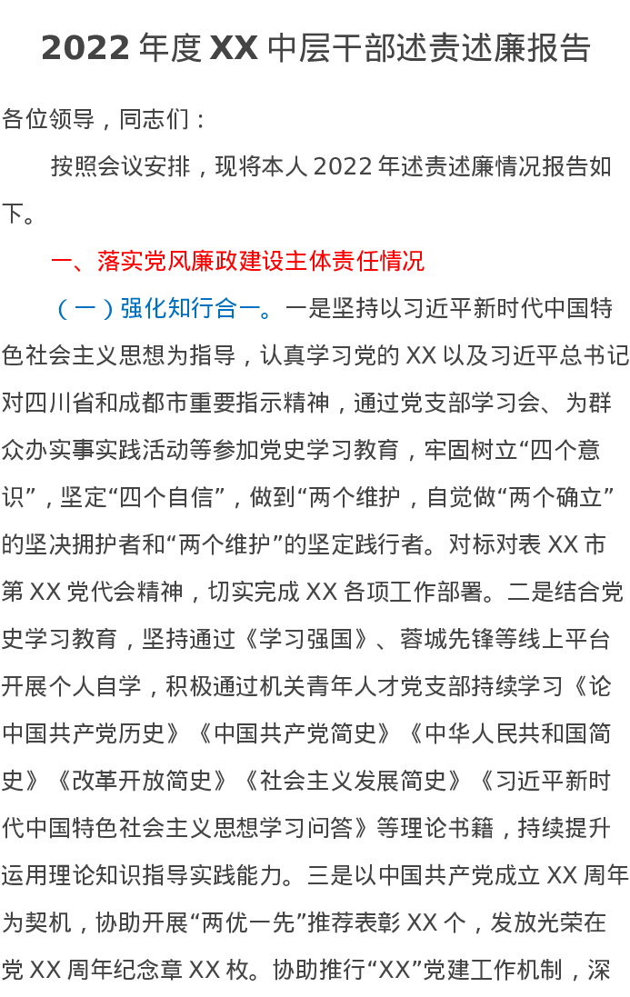 2022年度XX中层干部述责述廉报告