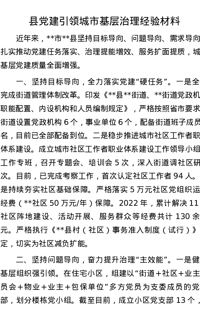 县党建引领城市基层治理经验材料