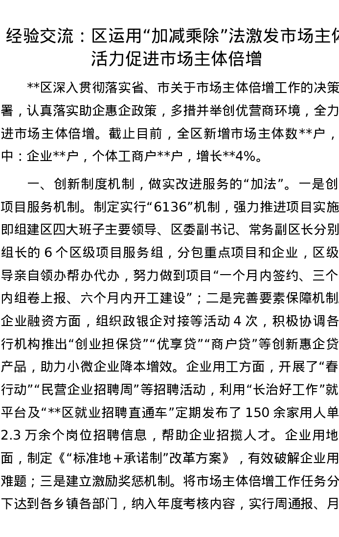 经验交流:区运用“加减乘除”法激发市场主体活力 促进市场主体倍增