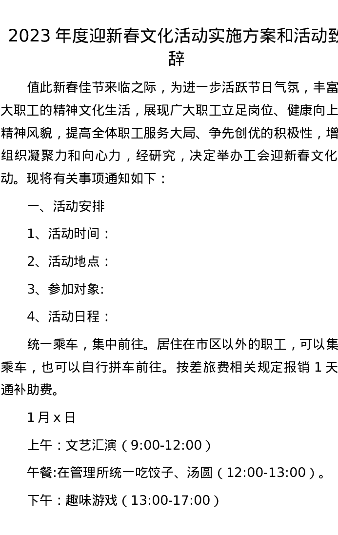2023年度迎新春文化活动实施方案和活动致辞
