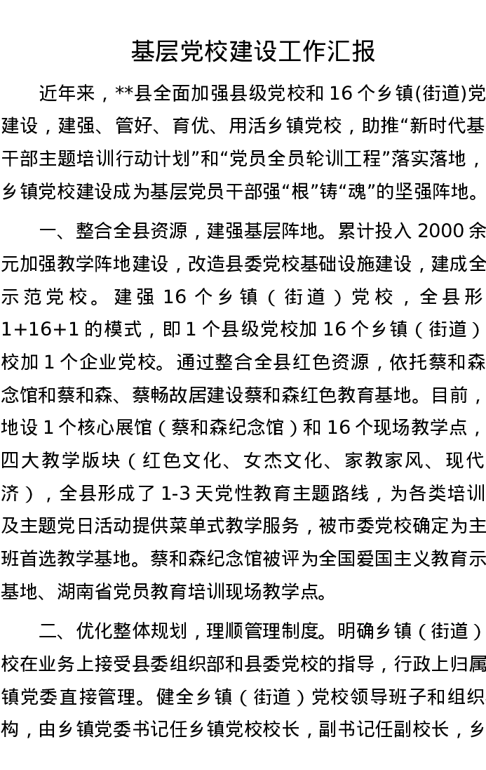 基层党校建设工作汇报