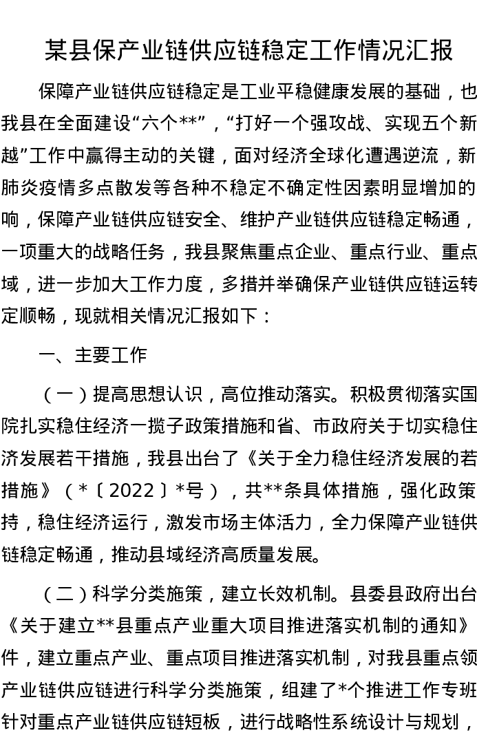 某县保产业链供应链稳定工作情况汇报