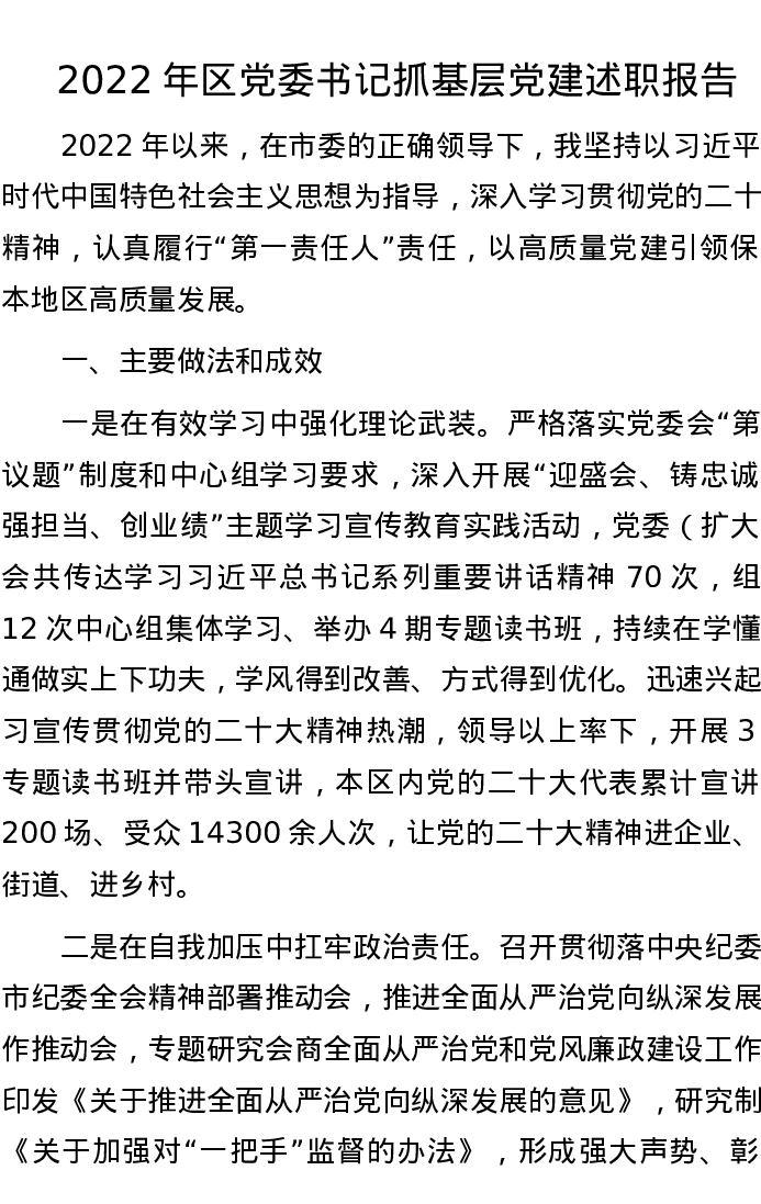 2022年区党委书记抓基层党建述职报告