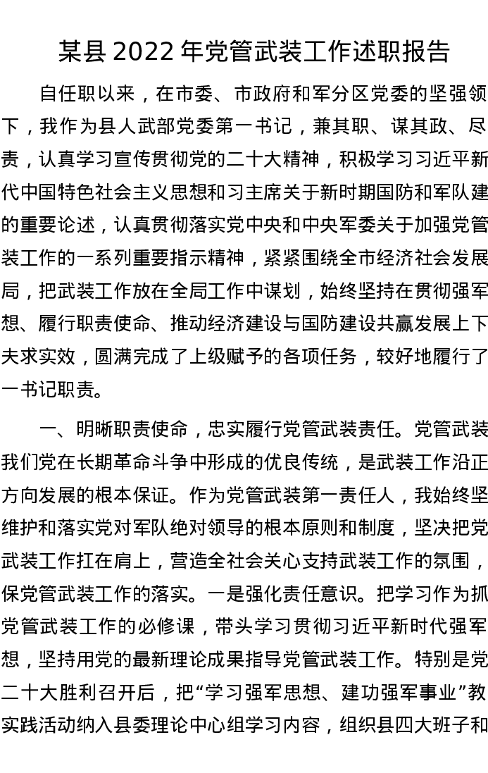 某县2022年党管武装工作述职报告
