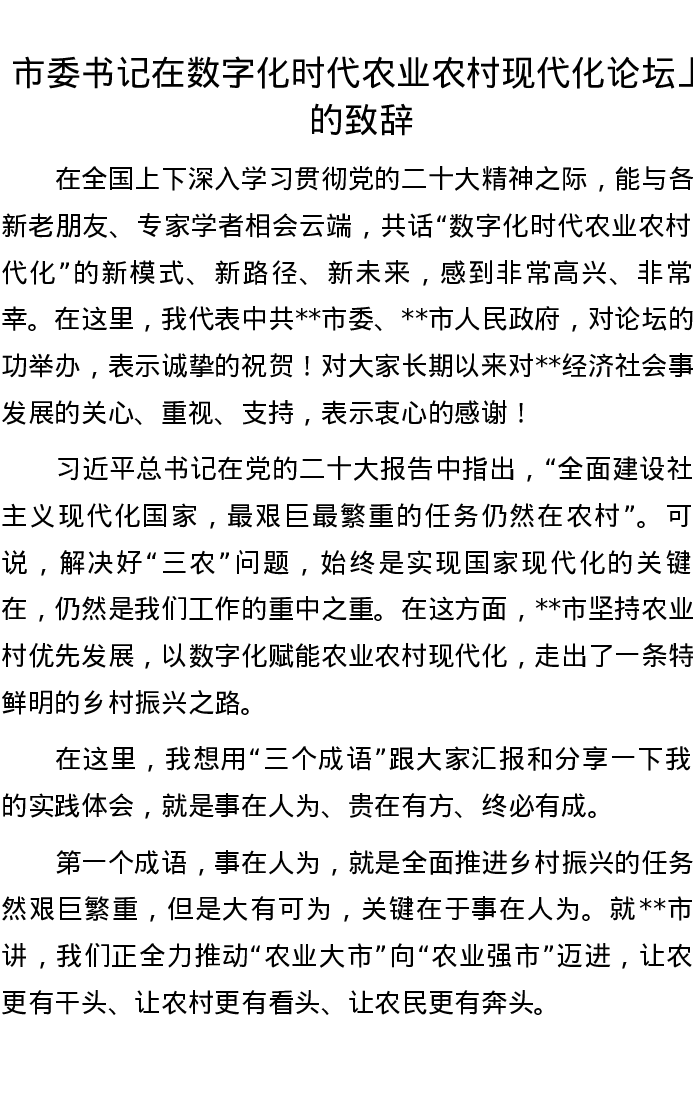 市委书记在数字化时代农业农村现代化论坛上的致辞