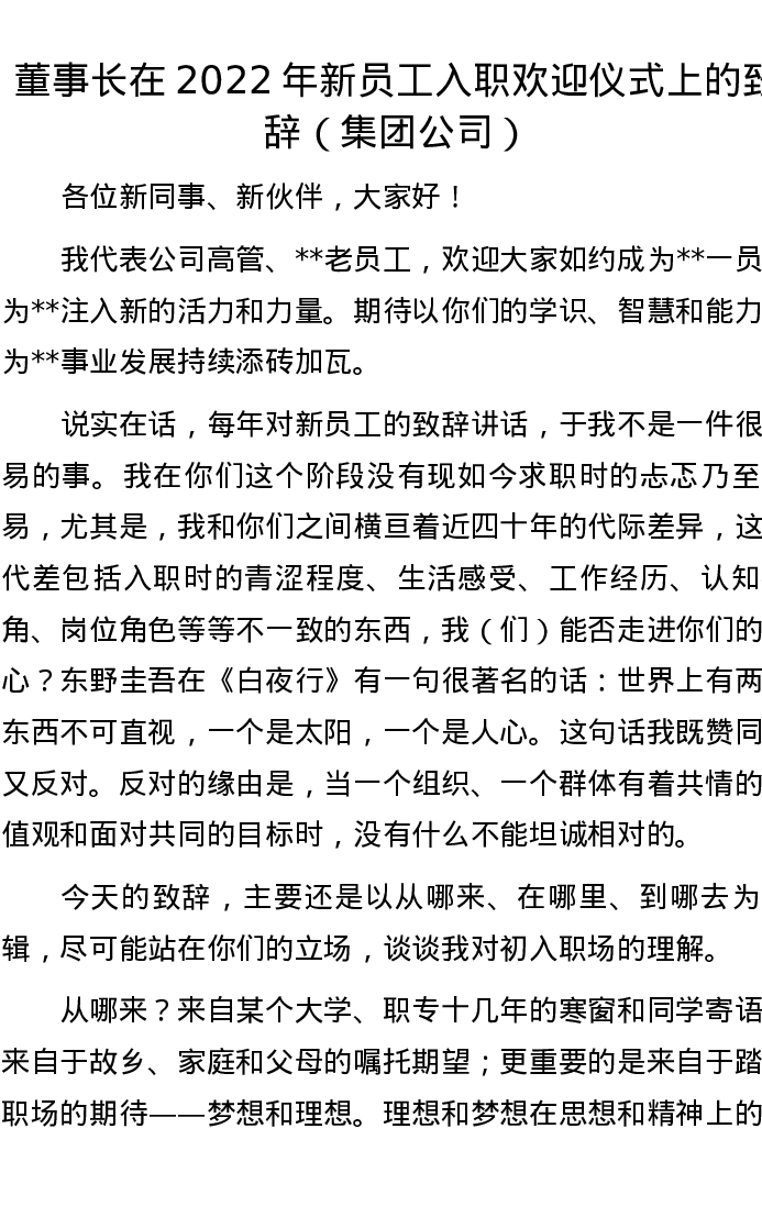 董事长在2022年新员工入职欢迎仪式上的致辞(集团公司)