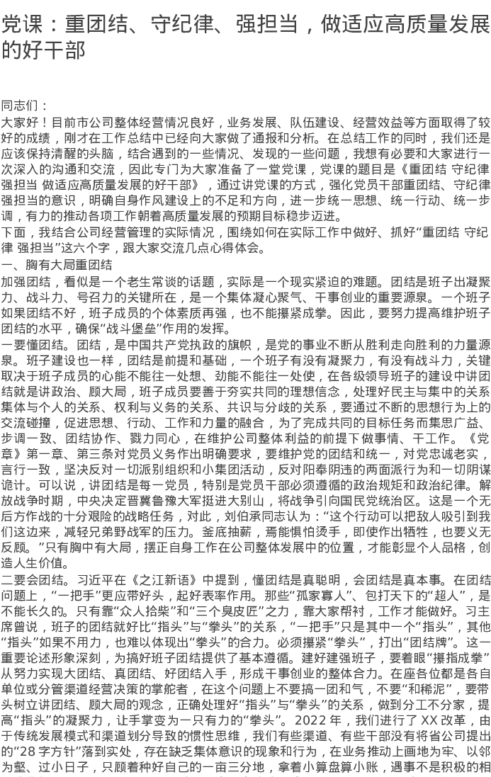 党课:重团结、守纪律、强担当,做适应高质量发展的好干部