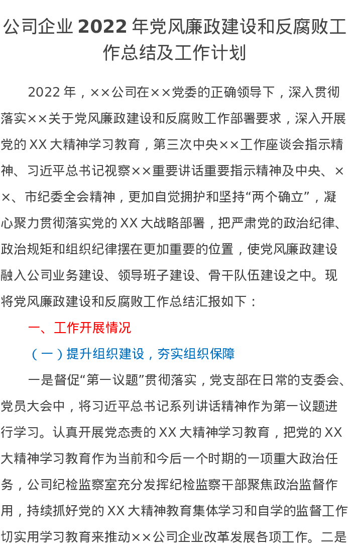公司企业2022年党风廉政建设和反腐败工作总结及工作计划