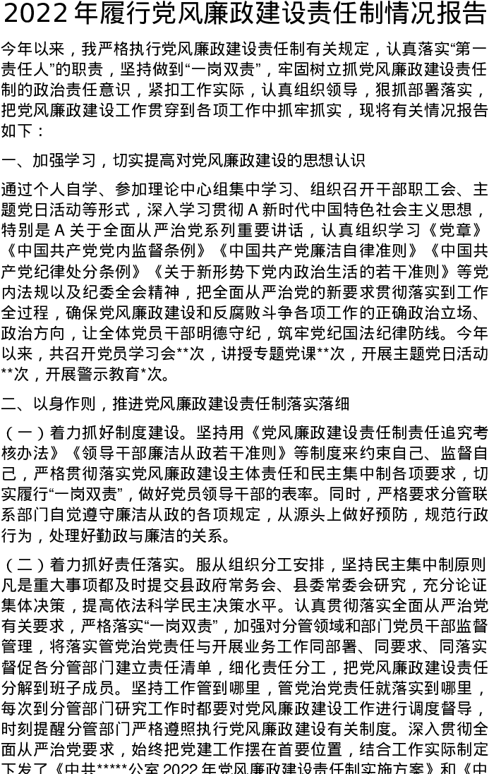 2022年履行党风廉政建设责任制情况报告