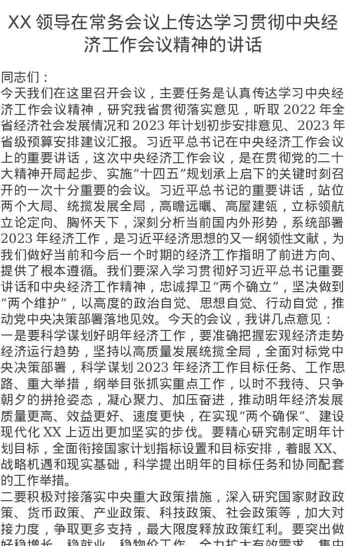 XX领导在常务会议上传达学习贯彻中央经济工作会议精神的讲话