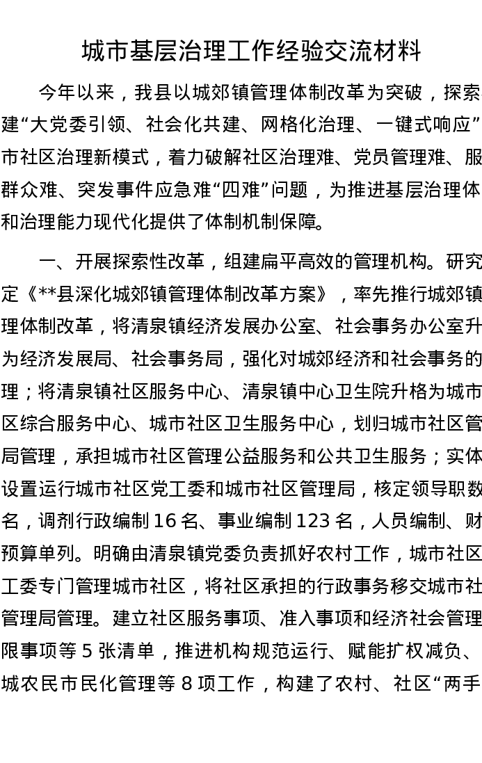 城市基层治理工作经验交流材料
