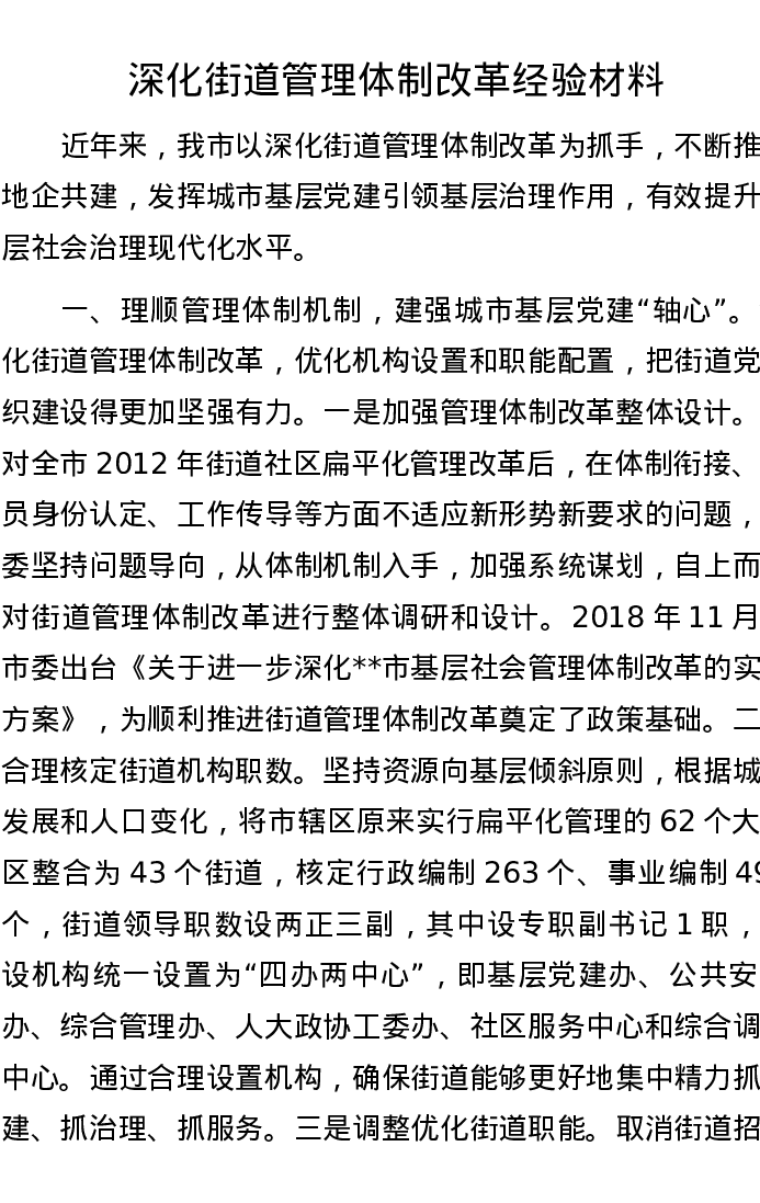 深化街道管理体制改革经验材料