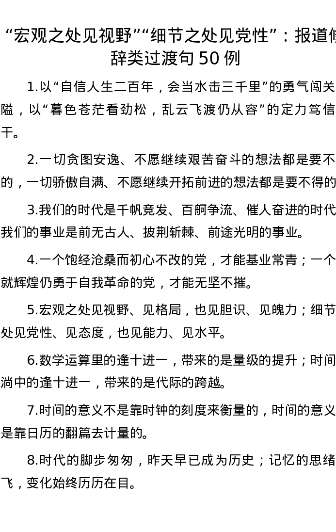 “宏观之处见视野”“细节之处见党性”:报道修辞类过渡句50例