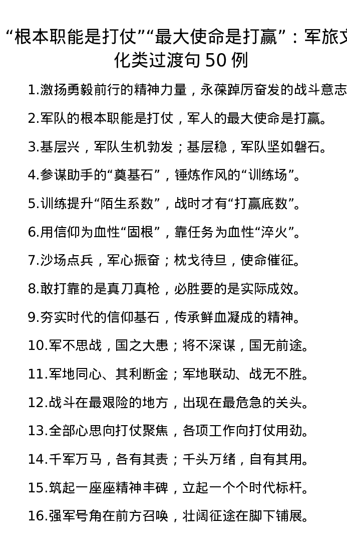 “根本职能是打仗”“最大使命是打赢”:军旅文化类过渡句50例