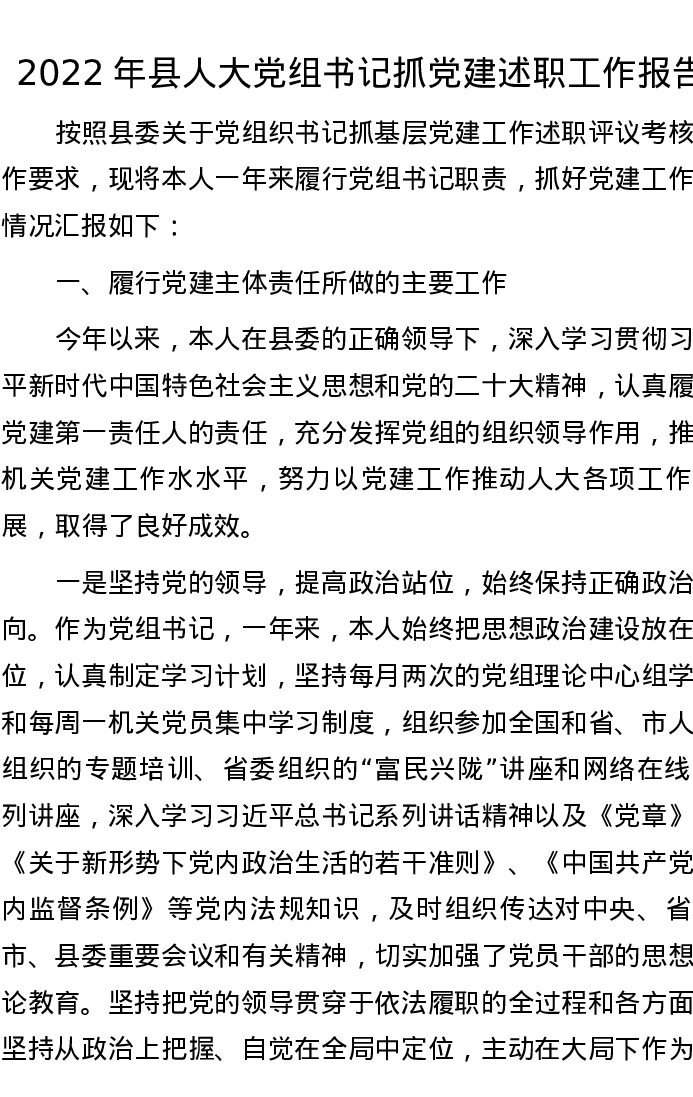 2022年县人大党组书记抓党建述职工作报告