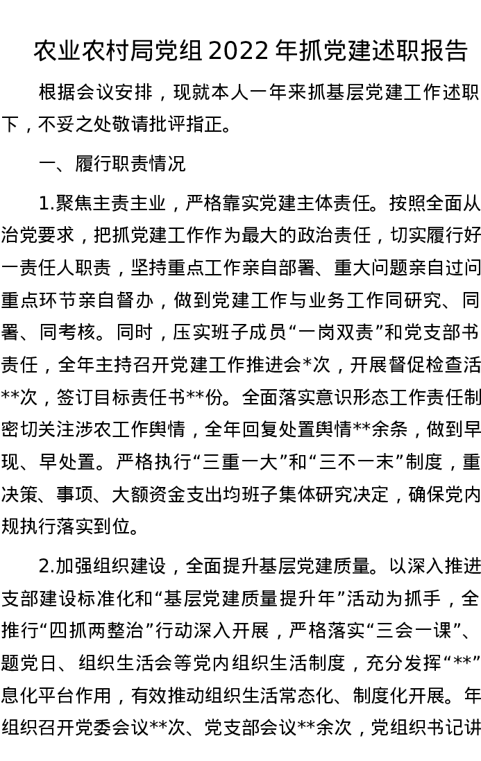 农业农村局党组2022年抓党建述职报告
