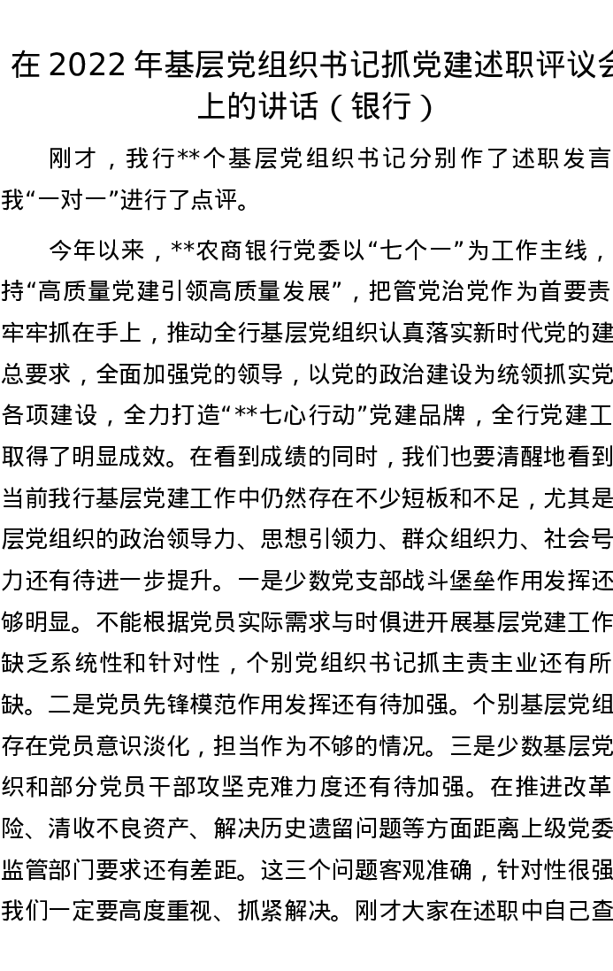 在2022年基层党组织书记抓党建述职评议会上的讲话(银行)