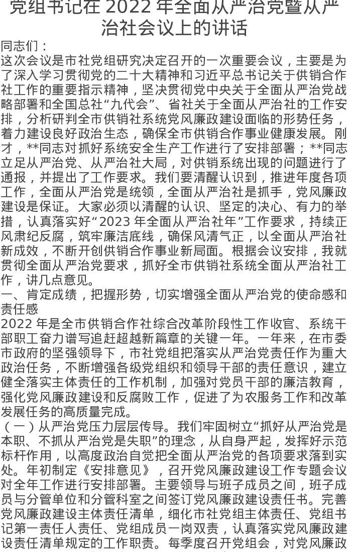 党组书记在2022年全面从严治党暨从严治社会议上的讲话