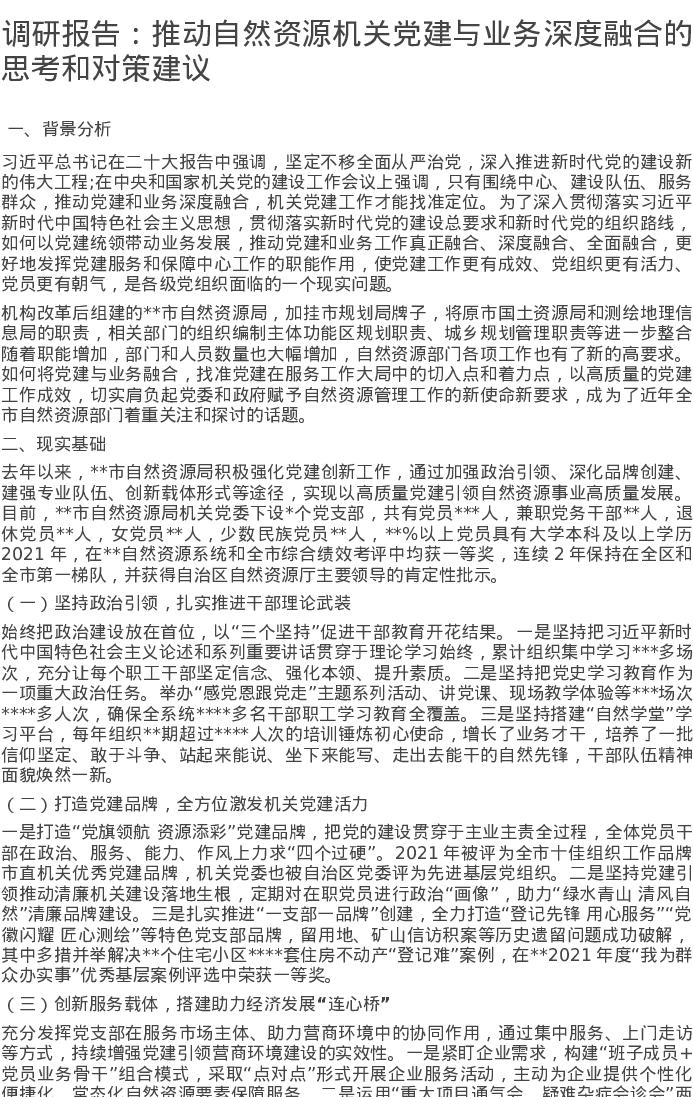 调研报告:推动自然资源机关党建与业务深度融合的思考和对策建议