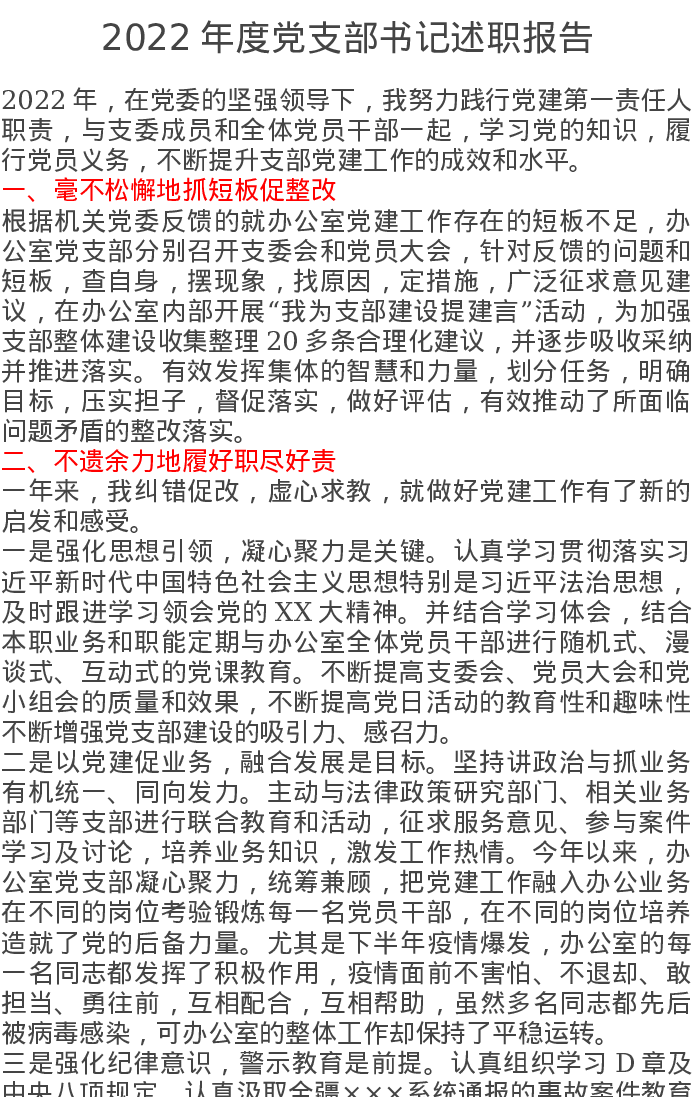 2022年度党支部书记述职报告