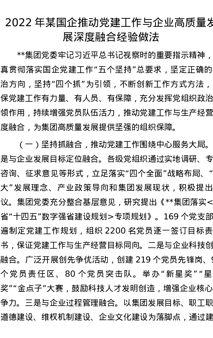 2022年某国企推动党建工作与企业高质量发展深度融合经验做法