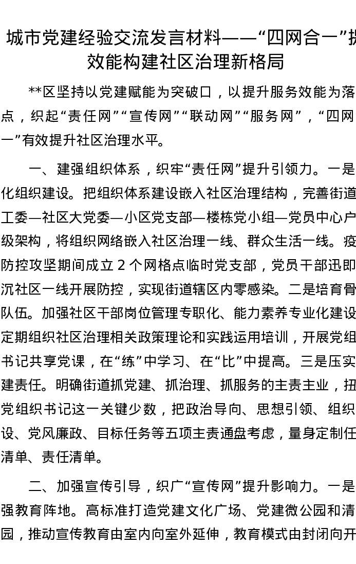城市党建经验交流发言材料——“四网合一”提效能 构建社区治理新格局