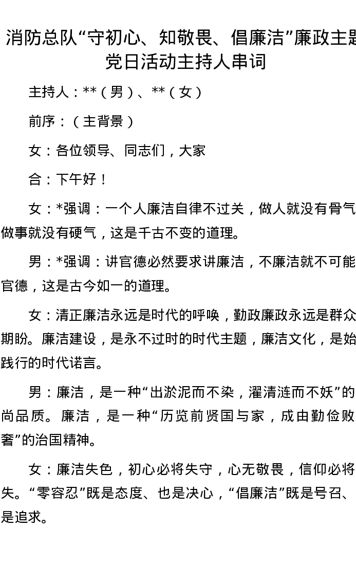 消防总队“守初心、知敬畏、倡廉洁”廉政主题党日活动主持人串词