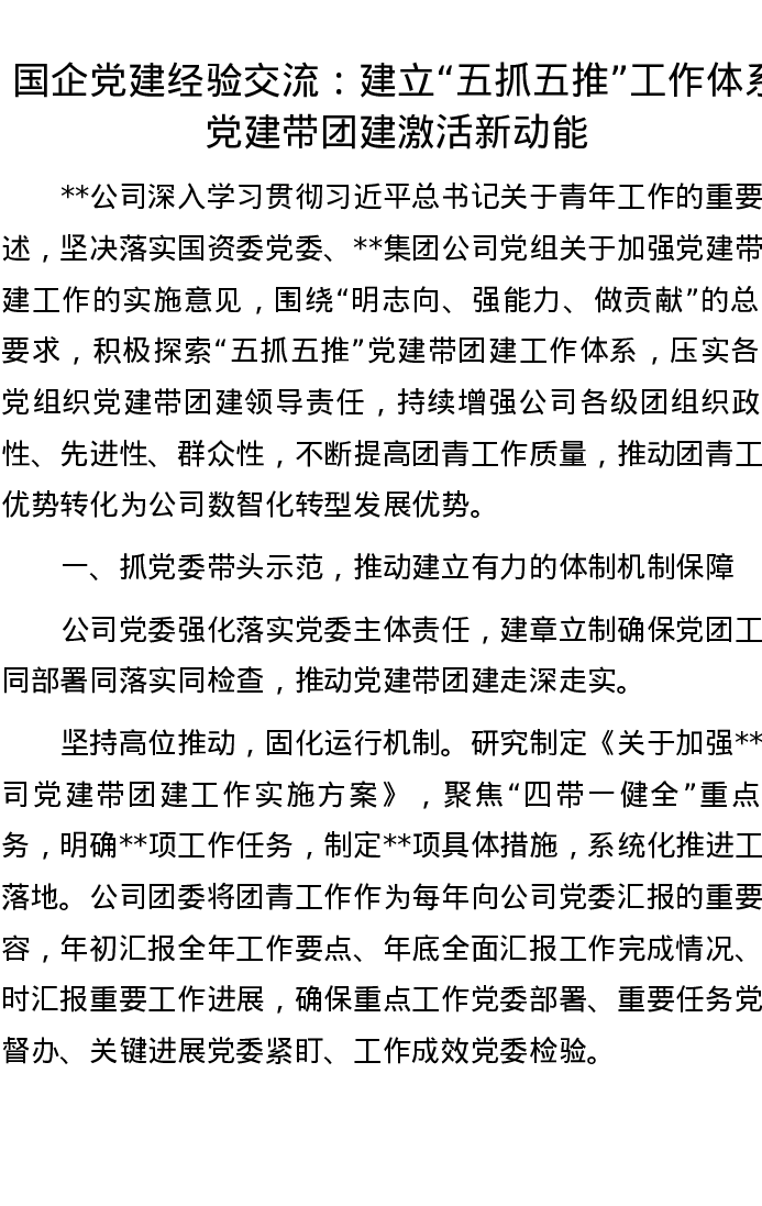 国企党建经验交流:建立“五抓五推”工作体系 党建带团建激活新动能