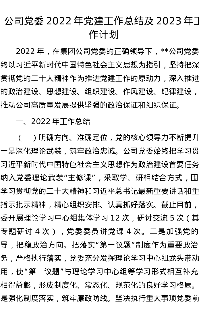 公司党委2022年党建工作总结及2023年工作计划