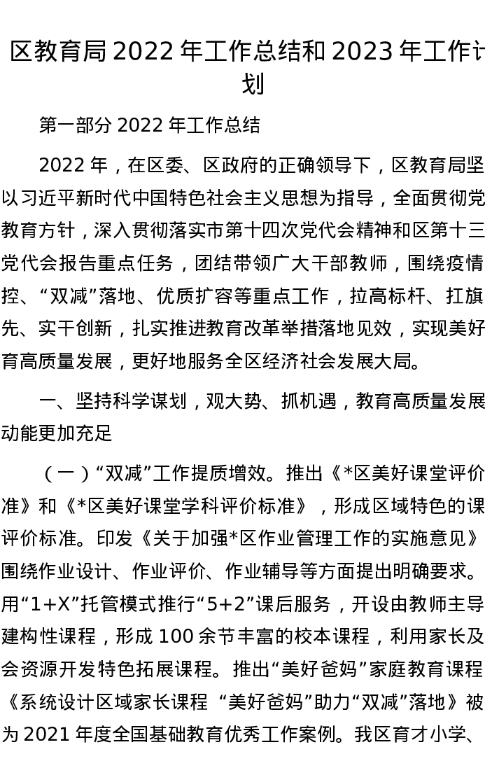 区教育局2022年工作总结和2023年工作计划