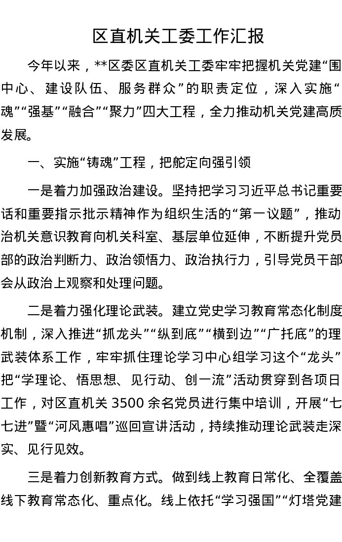 区直机关工委工作汇报
