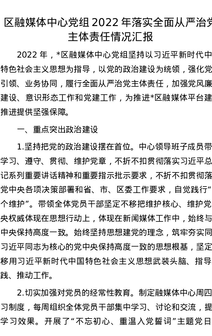 区融媒体中心党组2022年落实全面从严治党主体责任情况汇报