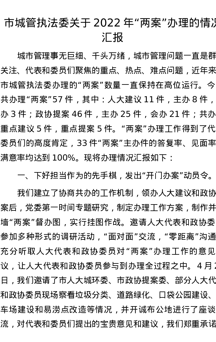 市城管执法委关于2022年“两案”办理的情况汇报