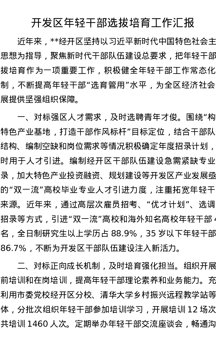 开发区年轻干部选拔培育工作汇报