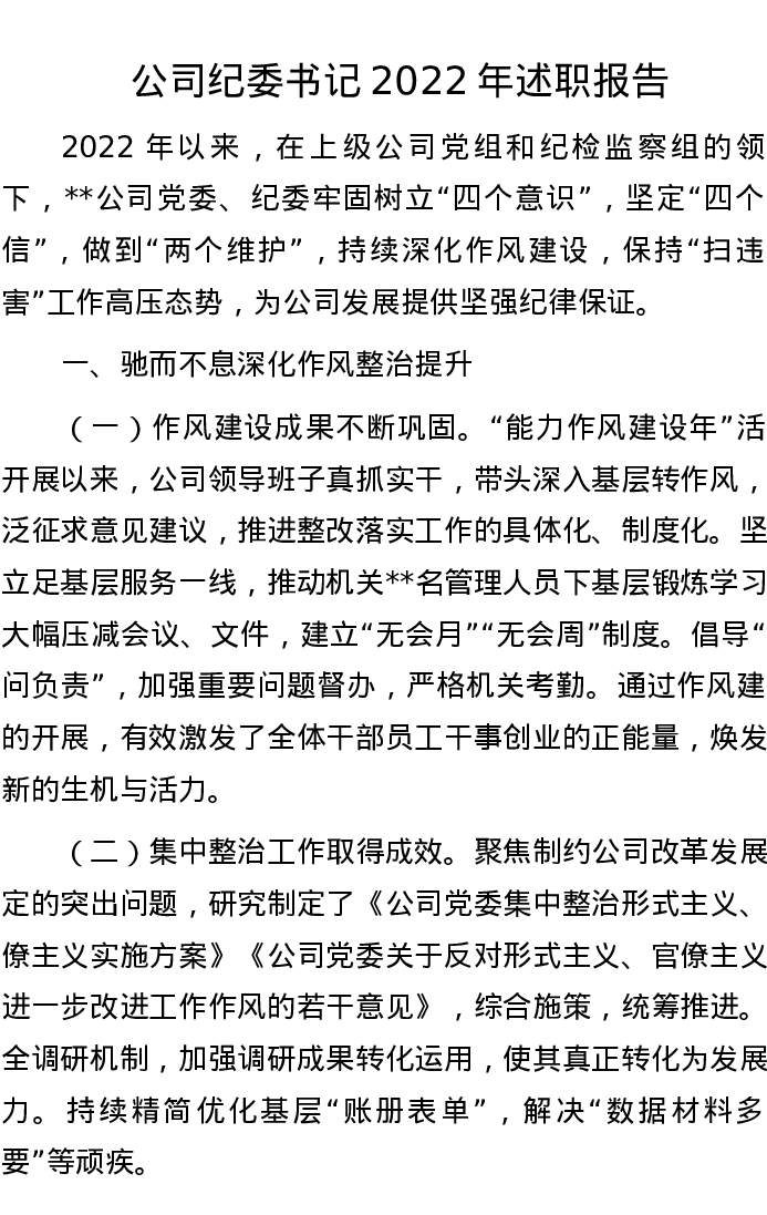 公司纪委书记2022年述职报告